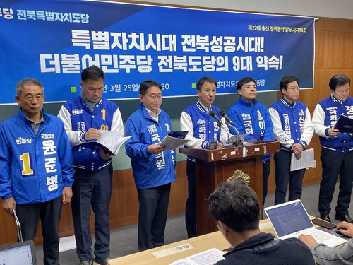 (전주=연합뉴스) 임채두 기자 = 더불어민주당 전북특별자치도당이 4·10 총선 승리를 위해 금융도시, 그린 성장 중심지 조성 등을 중심으로 한 '9대 정책'을 발표했다.