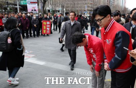 한 위원장은 이날 오전 8시부터 서울 지하철 여의도역 5번 출구 앞에서 빨간 야구점퍼를 입고 시민들에게 "안녕하세요"라며 고개 숙여 인사를 건넸다. 박용찬 국민의힘 영등포을 후보가 함께했다. 출근길의 시민들은 눈길도 주지 않은 채 발길을 재촉할 뿐이었다. 시민들은 좁은 출구 앞에 줄지어 서있는 한 위원장과 후보들을 짜증스러운 표정으로 쳐다보곤 했다. 30대로 보이는 한 남성은 고개를 절레절레 흔들며 지나치기도 했다. 한 20대 여성은 부담스러운 듯한 위원장과 후보들의 뒤쪽으로 빠져나갔다.