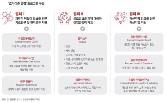 과학기술정보통신부 이종호 장관은 25일(한국시간) '호라이즌 유럽'의 준회원국 협상안에 사인했다. 호라이즌 유럽에서 우리나라가 참여할 수 있는 영역은 오는 2027년까지 7년간 511억 유로(약 74조원)를 투입하는 '글로벌 도전과제 대응과 산업경쟁력 제고'로 핵심정책 분야들을 지원한다. 주로 산업화에 초점을 맞춘 R&D로, 총 예산의 53.5%에 달한다.