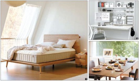① 따뜻하고 아늑한 침실 공간을 조성할 수 있는 밝고 내추럴한 무드의 침대 ‘헤이즐’. ② 사용자가 취향과 필요에 따라 크기·색상·형태를 조합할 수 있는 책상 ‘로이 뮤트 에디션’. ③ 고급스러운 월넛 컬러의 원목 소재로 감각적인 다이닝 룸을 연출할 수 있는 테이블 ‘모리니’. [사진 일룸] |