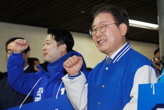 이재명 더불어민주당 대표가 26일 서대문구 아현역에서 김동아 후보와 시민들에게 인사하고 있다. [연합] |