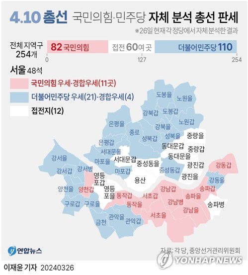 (서울=연합뉴스) 류미나 설승은 한주홍 김철선 기자 = 4·10 총선을 15일 앞둔 26일 거대 양당이 판세를 자체 분석한 결과 승리 가능성이 큰 '우세' 지역으로 국민의힘은 82곳을, 더불어민주당은 110곳을 각각 꼽고 있는 것으로 나타났다.