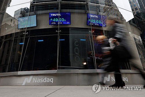 2024년 3워 26일 미국 뉴욕의 나스닥 마켓플레이스에 트럼프 미디어 앤드 테크놀로지 그룹의 주가가 표시되고 있다. |