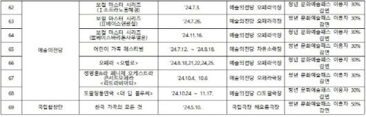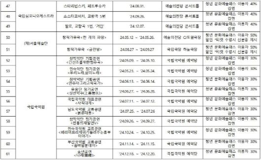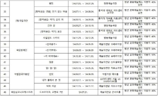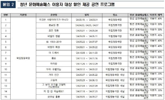 아울러 국립발레단을 비롯한 11개 국립 예술단체와 공연시설들은 ‘청년 문화예술패스’ 이용자 대상으로 관람권 할인 서비스를 제공한다. 할인 혜택을 적용받을 수 있는 주요 공연을 살펴보면 △국립정동극장의 ‘봄날의 춤’(4월 3, 5, 7일) △서울예술단 ‘천 개의 파랑’(5월 12~26일) △국립극단 ‘햄릿’(7월 5~29일) △국립발레단 ‘라 바야데르’(10월 30일~11월 30일) △국립심포니오케스트라 ‘말러, 교향곡 1번 거인’(12월 7일) 등이다. 관람권 할인율은 공연마다 다르며 참여 기관과 공연에 대한 자세한 내용은 4월중 문예위 누리소통망(SNS)에서 확인할 수 있다.