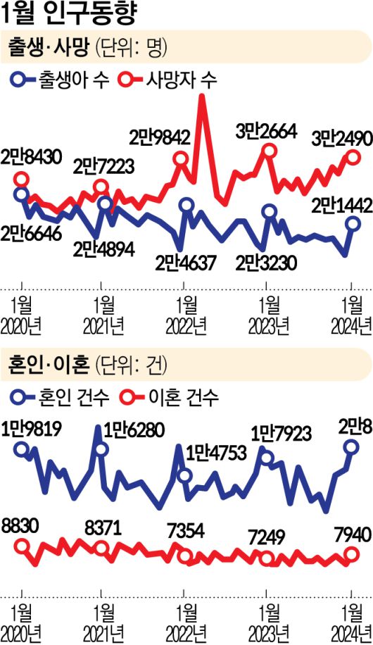 통계청은 27일 발표한 ‘2024년 1월 인구동향’에서 올해 1월 혼인 건수가 2만8건으로 전년 동월보다 2085건(11.6%) 증가했다고 밝혔다. 1월 기준 혼인 건수가 2만 건을 넘어선 건 2019년 이후 5년 만이다. 월 단위로는 2020년 12월 이후 37개월 만에 2만 건대에 재진입했다.