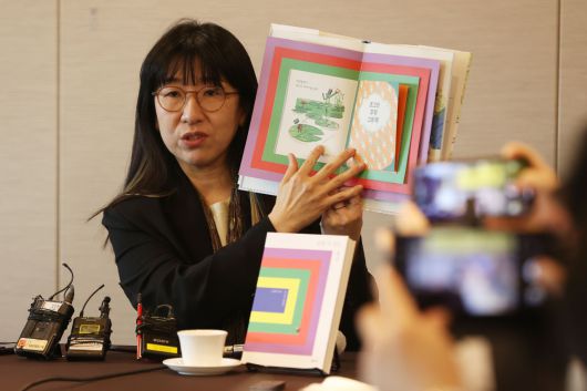 이수지 작가가 26일 오전 서울 중구 프레스센터에서 열린 에세이 '만질 수 있는 생각' 출간 기념 기자간담회에서 책을 소개하고 있다. [연합] |
