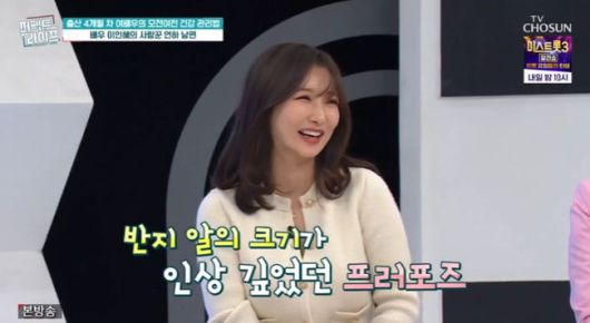 그러자 현영은 "그러면 식당이 아니라 레스토랑이네"라고 놀랐고, 이인혜는 "혹할만한 좋은 선물로 반지해줬다"고 자랑했다. 현영은 "다이아몬트 큰걸로?"라고 물었고, 이인혜는 고개를 끄덕이며 "큰 프러포즈보다 이걸 내밀면서 해줘서 인상깊었던 기억이 난다"고 말했다.