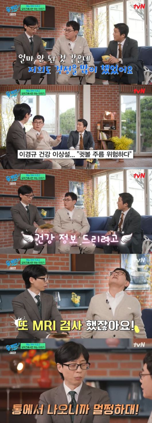 또 유재석은 "얼마 안 된 거 같은데 저희도 걱정을 많이 했었다. 한동안 이경규 형님께서 몸이 좀 아프셨다"라며 걱정했고, 이경규는 "기사까지 났다. 이경규 건강 이상설. 귓불에 주름"이라며 못박았다.
