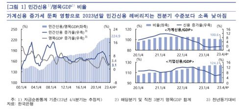 한은이 28일 발표한 '금융안정 보고서'에 따르면 작년 4분기 말 명목 국내총생산(GDP) 대비 민간신용(자금순환통계상 가계·기업 부채 합) 비율은 224.9%로 집계됐다.