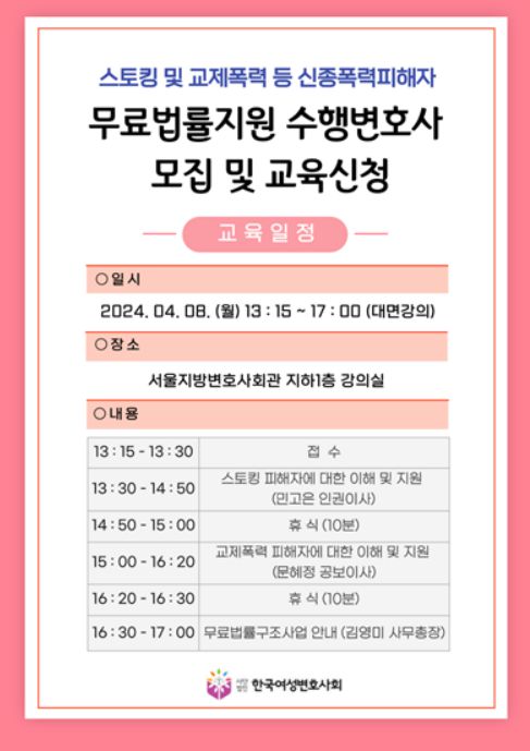 한국여성변호사회 민고은 인권이사가 ‘스토킹 피해자에 대한 이해 및 지원’을 주제로, 문혜정 공보이사가 ‘교제폭력 피해자에 대한 이해 및 지원’을 주제로, 김영미 사무총장이 ‘무료법률구조사업 안내’를 주제로 각각 강의를 진행한다.