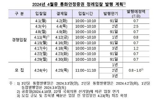 이달 발행 계획 물량과 비교하면 발행 규모가 1조원 늘었다. 9조원 가운데 8조원은 경쟁입찰 방식으로, 8천억∼1조원은 모집 방식으로 발행될 예정이다.