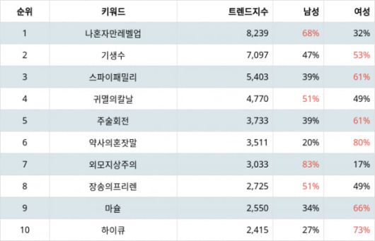 성별 선호도 분석 결과 1위 나 혼자만 레벨업은 남성 68%, 여성 32%, 2위 기생수는 남성 47%, 여성 53%, 3위 스파이 패밀리는 남성 39%, 여성 61%가 선호하는 것으로 나타났다.