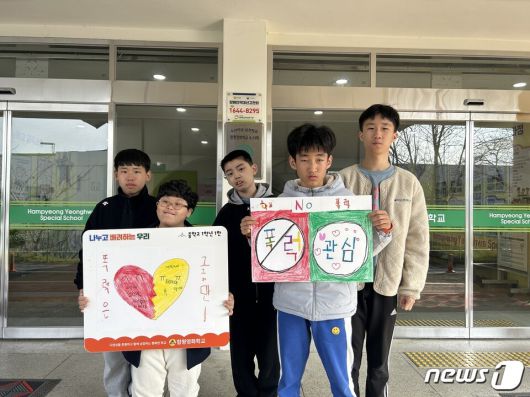 함평영화학교(교장 박상래)- 지난 26일 학교폭력 예방을 위한 캠페인을 실시했다. 학생들은 '상처 받은 마음 사랑으로 치료해요!', '친구 때리기 NO! 함께 놀아요 YES!' 등의 글귀가 적힌 포스터를 제작하여 학교 곳곳에 게시했다. 함평영화학교는 지적장애 학생을 위한 특수교육기관이다.(전남교육청 제공)/뉴스1 |