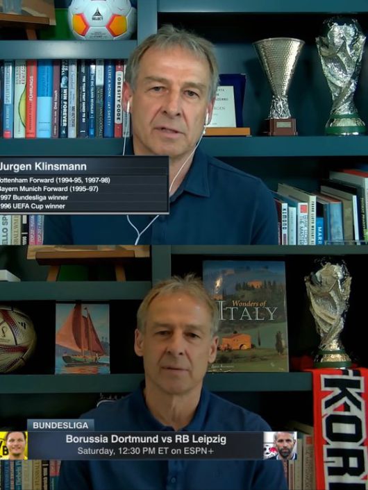 지난 23일 미국 스포츠 전문매체 ESPN 유튜브 채널에 출연한 위르겐 클린스만 전 감독이 한국 축구 국가대표팀에서 경질된 뒤 ‘KOREA(한국)’이라고 적힌 머플러를 치웠다. 아래는 한국 대표팀 감독 시절 출연한 모습. 사진 유튜브 캡처 |