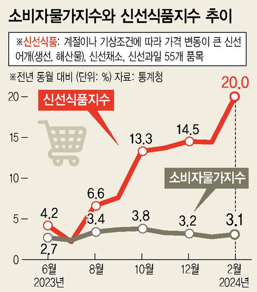 31일 정부 관계자들의 설명을 종합하면, 통계청은 다음달 2일 3월 소비자물가 동향 조사 결과를 발표한다. 앞서 소비자물가 상승률(지난해 같은 달 대비)은 지난 1월 2.8%로 6개월 만에 2%대로 내려간 바 있다. 그러나 지난달 사과 등 농산물 가격 급등으로 지난달 3.1%로 상승했다.