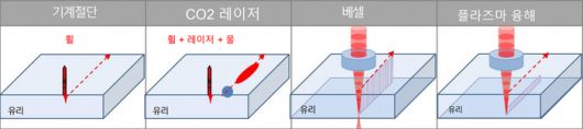 베셀 방식(위)와 플라즈마 멜팅방식(아래) 유리기판 절단면 비교 |
