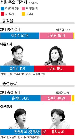 전문가들과 양당이 모두 승부처로 꼽는 지역은 ‘한강 벨트’다. 동작을에선 류삼영 민주당 후보와 나경원 전 의원이 맞붙는다. 21대 총선에서 이수진 민주당 의원이 52.16%의 득표율로 나 전 의원을 꺾은 바 있다. 하지만 지난 29일 KBS가 한국리서치에 의뢰해 발표한 조사에선 나 전 의원이 49%, 류 후보가 41.0%로 조사됐다. 용산은 지난 총선에서도 치열했다. 권영세 국민의힘 의원과 강태용 민주당 후보가 ‘리바이벌’ 매치를 치른다. 21대 총선에선 두 후보의 격차는 0.66%포인트 차이에 불과했다. 당시에는 정의당의 정연욱 후보가 3.18%를 득표한 바도 있다. 지난 28일 MBC가 코리아리서치에 의뢰해 발표한 조사에선 강 후보가 42%, 권 의원이 41%로 조사됐다. 두 지역 모두 지난 총선과 최근 여론조사가 다른 결과를 나타내는 셈이다.