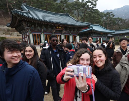 한국을 방문 중인 미국 하버드대학교 래드클리프 오케스트라 동호회 학생들이 지난 12일 서울 은평구 진관사에서 사찰 체험을 하며 대웅전을 배경으로 셀카를 찍고 있다. 연합뉴스 |