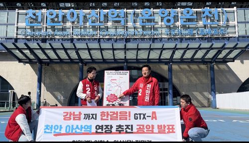 국민의힘 소속 전만권 아산을 후보와 이창수 천안병 후보는 이날 오전 KTX 천안아산역 앞에서 공동으로 '천안·아산 신 교통혁명 공약'을 발표했다.