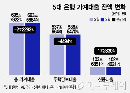 1일 은행권에 따르면 5대 은행(KB국민·신한·하나·우리·NH농협)의 지난달 말 가계대출 잔액은 693조5683억원으로 전월(695조7922억원)보다 2조2238억원 줄었다. 가계대출에서 가장 큰 비중을 차지하는 주택담보대출 잔액도 같은 기간 4494억원 감소한 536조6470억원을 기록했다. 가계대출과 주담대 잔액이 줄어든 것은 각각 지난해 4월 이후 11개월 만이다.