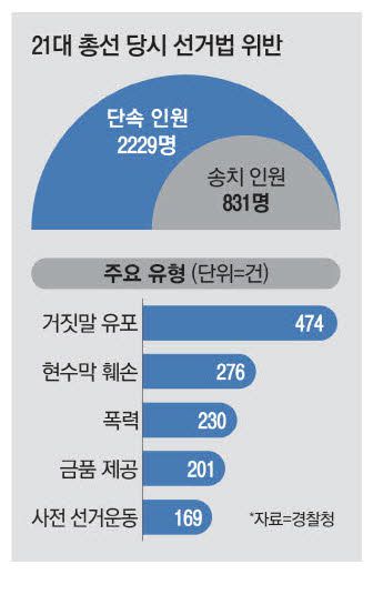 선거철이면 공직선거법을 위반하는 선거사범이 크게 늘어난다. 경찰청에 따르면 2020년 21대 총선 당시 선거법 위반으로 적발된 인원은 2229명에 이른다. 제8회 지방선거가 열렸던 2022년에는 2179명이 선거법을 위반해 검거됐다.