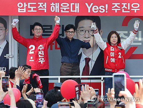 한동훈 총괄선대위원장은 이날 부산에서 사상, 중·영도구, 남구, 부산진구, 연제구, 해운대구, 북구 등 7곳을 차례로 훑은 뒤 경남 창원 진해와 성산, 김해까지 방문했다.