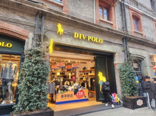 '디브폴로'(DIV.POLO). 국내에도 익숙한 폴로 랄프로렌의 로고와 이름을 살짝 변형한 브랜드였다. 기존 브랜드명에 알파벳을 추가하고 말을 탄 사람이 스틱을 위로 든 로고에서 스틱 그림만 쏙 뺐다. 노란 조명을 켠 매장 곳곳에는 '최대 90% 세일'이라고 적힌 안내판이 붙었다.