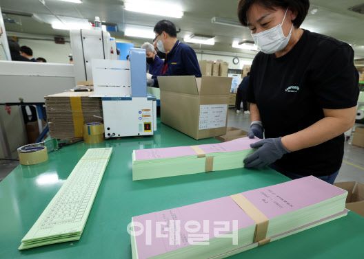 [이데일리 방인권 기자] 제22대 국회의원 선거를 아흐레 앞둔 1일 경기 안양시 동안구의 한 인쇄업체에서 투표용지가 인쇄되고 있다. |