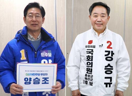 (홍성=연합뉴스) 김소연 기자 = 총선을 여드레 앞두고 충남 홍성·예산 지역구 더불어민주당 양승조 후보와 국민의힘 강승규 후보가 토론회 발언을 두고 맞고발을 하며 신경전을 벌이고 있다.