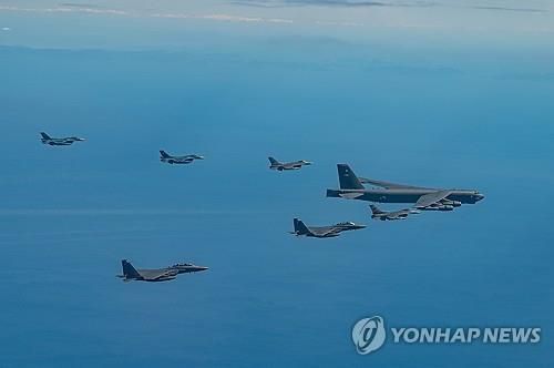 (서울=연합뉴스) 박수윤 기자 = 핵무장이 가능한 미 공군 전략폭격기 B-52H가 2일 제주 동남방의 한일 간 방공식별구역(ADIZ)이 중첩되는 구역의 상공에서 한일 공군과 연합훈련을 했다.