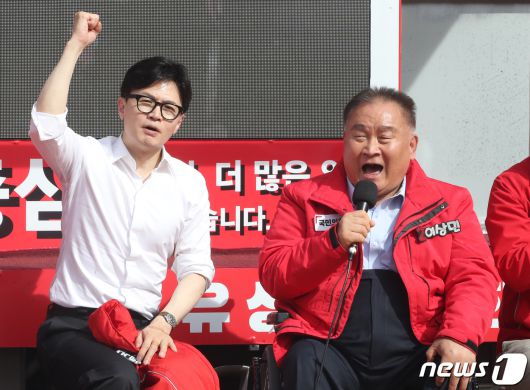 국민의힘은 야당을 향한 공세 수위도 최고조로 끌어올렸다. 한 위원장은 이날 충남 당진 유세에서 편법 대출 의혹을 받는 양문석 경기 안산갑 후보를 겨냥해 "음주운전하고 음주운전한 차를 팔면 용서가 되는 것이냐"며 후보직 사퇴를 요구했다. 그는 "범죄자를 심판하고, 이·조(이재명·조국) 심판을 해야 한다"며 "이런 사람들이 대한민국 미래를 좌우하게 둘 건가. 거짓말만 하는 사람들을 몰아내야 한다"고 목소리를 높였다.