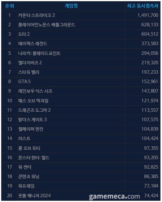 ▲ 4월 2일 오후 4시 기준 스팀 일 최고 동시접속자 TOP20 (자료출처: 스팀) |