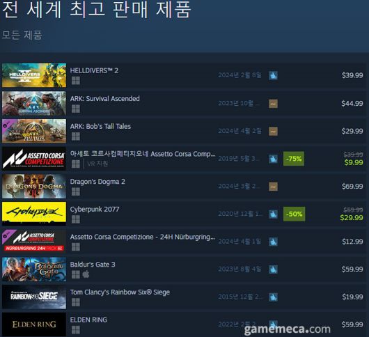 ▲ 4월 2일 오후 4시 기준 스팀 전세계 최고 판매 제품 TOP10 (자료출처: 스팀) |