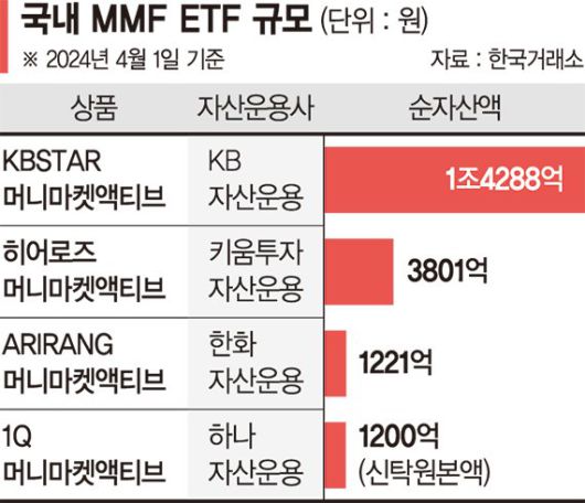 지난 2월 말 상장한 '히어로즈 머니마켓액티브'의 순자산은 3801억원이다. 해당 상품은 특히 순자산 증액 속도가 빨랐다. 설정원본액 1700억원으로 시작, 한 달이 넘은 시점에 2배 이상으로 늘렸다. 대부분 증권사, 보험사 등 기관 자금이 투입된 수치라는 설명이다.