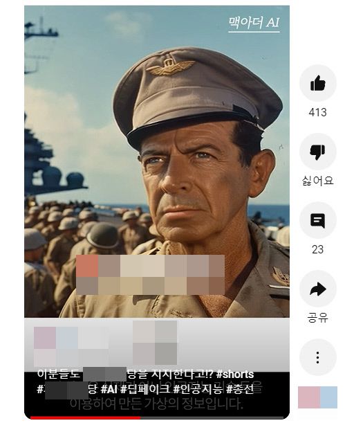 인터넷상에서는 이날도 외국 유명 인사들이 명언과 함께 특정 당 이름을 반복적으로 외치는 딥페이크 영상(사진)이 쉽게 검색됐다. 링컨이 “국민의, 국민을 위한, 국민에 의한 XXXX당”이라고 말하고, 맥아더가 “노병은 죽지 않는다. 다만 사라질 뿐이다. XXXX당”이라고 외치는 식이다. 영상에는 “이분들도 XXXXX를 지지한다고!?”라는 제목도 달렸다. 설명에는 해시태그로 이 영상이 AI 편집물, 딥페이크라는 사실도 적시했다. 해당 유튜브 채널에는 이 당과 전광훈 목사에 대한 영상이 다수 올라와 있다.