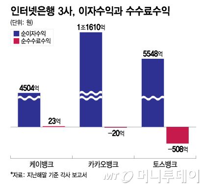 인터넷은행 3사, 이자수익과 수수료수익/그래픽=이지혜 |