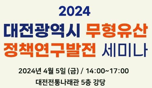(대전=연합뉴스) 김준호 기자 = 대전무형문화재 연합회는 오는 5일 오후 2시 대전 동구 소제동 전통나래관에서 '대전시 무형유산 정책 연구 발전 학술세미나'를 개최한다고 3일 밝혔다.
