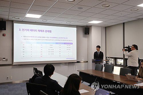 (고양=연합뉴스) 임병식 기자 = 3일 경기도 고양시 삼성화재 글로벌캠퍼스에서 열린 전기차 고전압배터리 재제조 활성화 필요성 언론 브리핑에서 삼성화재 교통안전문화연구소 김승기 책임연구원이 제조사 별 전기차 배터리 수리 및 교환 기준을 설명하고 있다.