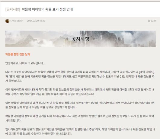 3일 게임 업계에 따르면 위메이드는 지난달 29일 다중접속역할수행게임(MMORPG) '나이트 크로우' 공지사항을 통해 "특정 확률형 아이템 1종에 대한 웹사이트 내 확률 정보가 실제 확률과 차이가 있음이 확인됐다"며 "실제 게임 내 적용된 확률 정보로 정정하고자 한다"고 밝혔다.