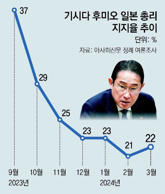 지난해 말 아베파 등 주요 파벌이 정치자금을 받아 일부를 뒷돈으로 챙긴 ‘비자금 스캔들’이 불거지면서 기시다 내각 지지율은 주요 여론조사에서 10∼20%대로 추락했다. 과거 일본에서 이 정도까지 지지율이 하락하면 총리가 퇴임했다. 기시다 총리는 당내에서 별다른 차기 총리감이 보이지 않는다는 이유로 총리직을 고수하고 있다.