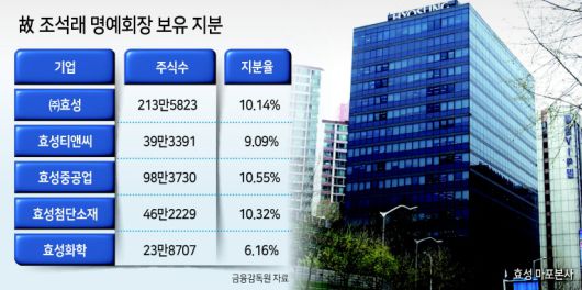 5일 재계에 따르면, 조 명예회장이 보유한 ㈜효성 지분은 213만5823주로 지분율은 10.14%에 달한다. 주요 계열사인 효성티앤씨의 경우 39만3391주(9.09%), 효성중공업 98만3730주(10.55%), 효성첨단소재 46만2229주(10.32%), 효성화학 23만8707주(6.16%)를 각각 보유하고 있다.