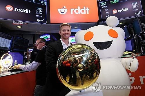 지난달 21일 레딧 상장일에 자사 마스코트 옆에 선 스티브 호프먼 CEO [로이터 연합뉴스 자료사진. 재판매 및 DB 금지] |