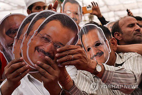 케지리왈 주총리 가면 쓰고 체포에 항의하는 인도 야권 지지자들 |