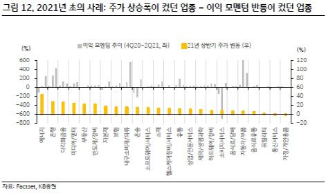 안 연구원은 “성장주 이익 모멘텀 하락은 가파른 성장 사이클 초입을 지난 뒤 안정되는 자연스러운 과정”이라며 “오히려 성장주에 쏠렸던 시장 관심이 이익 모멘텀이 개선되는 다른 업종으로 분산되면서 증시 강세의 영역이 광범위해지는 계기가 될 수 있다”고 말했다.
