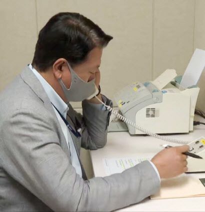 통일부 남북공동연락사무소에서 관계자가 통신연락선을 통해 북측과 통화를 하는 모습(사진=통일부) |