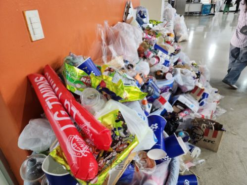 이러한 ‘규제의 빈틈’ 탓에 야구장 안팎에서는 이날도 일회용품, 먹다 남은 음식 등이 뒤섞인 쓰레기산이 여기저기 만들어졌다. 지난 2일에도 이곳에선 야구장 내 공식 판매점에서만 구단의 일회용 막대풍선 판매를 중단했을 뿐 야구장 안은 무법천지로 일회용품이 곳곳에 넘쳐났다.