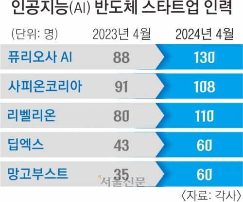 또 다른 AI 반도체 스타트업 리벨리온, 사피온코리아도 각각 110명, 108명으로 1년 전에 비해 30명, 17명 늘었다. 딥엑스는 내년 온디바이스 AI(클라우드를 거치지 않고 기기 내에서 작동) 반도체 출시를 앞두고 현 인력(60명)을 두 배로 늘린다는 계획이다.