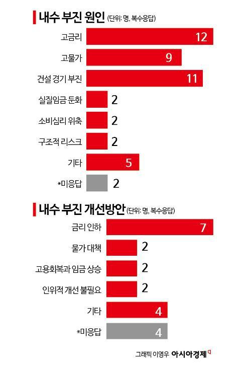 아시아경제가 국내외 증권사 애널리스트와 은행·경제연구소 이코노미스트 등 경제 전문가 20명을 대상으로 지난 1일부터 5일까지 설문조사를 진행한 결과 절반가량이 고금리, 고물가와 부동산 경기 침체를 내수 부진의 원인(복수응답)으로 꼽았다. 내수 부진을 해결하기 위해선 기준금리 인하가 이뤄져야 한다는 주장도 나왔다.