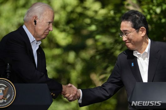 [캠프 데이비드(미국)=AP/뉴시스]기시다 후미오(岸田文雄) 일본 총리가 8일 오후 일본을 출발해 미국으로 향한다. 미일 동맹을 과시할 생각인 기시다 총리는 벚꽃 묘목, 노토반도(能登半島) 칠기 공예품 등을 선물할 전망이다. 사진은 조 바이든 미국 대통령(왼쪽)이 지난해 8월 18일(현지시간) 메릴랜드주에 위치한 미 대통령 별장 캠프 데이비드에서 열린 한미일 정상회의를 마친 뒤 가진 한미일 공동기자회견에서 기시다 후미오 일본 총리와 악수하고 있는 모습. 2024.04.08. |