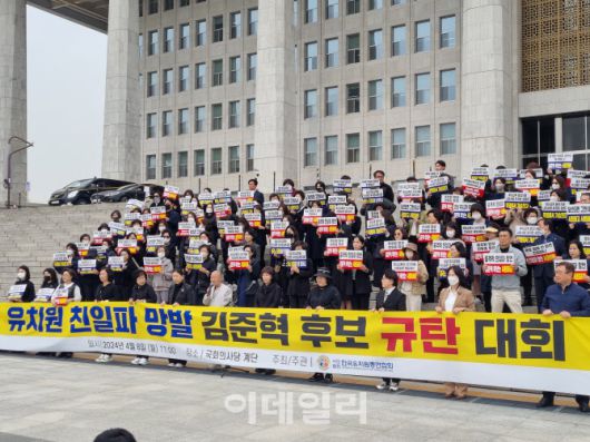 한국유치원총연합회(한유총)는 이날 오전 국회 본관 앞 계단에서 ‘김준혁 민주당 후보 망언 규탄대회’를 열고 “한유총을 정신적 친일파란 악의적인 오명을 씌워 매도한 김준혁 후보를 규탄한다”고 밝혔다.